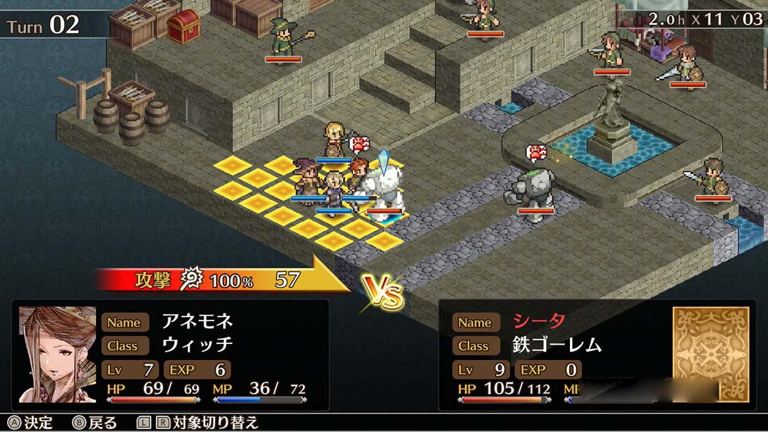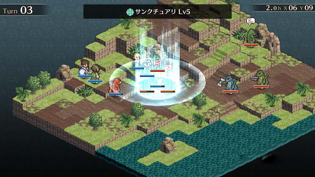 战斗在有高低差的四分之一视角的地图上进行,正面·背后·横向变化的战斗结果,根据我方角色的站位的援护效果等战略性的高度是特征。