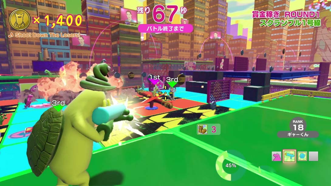 失败组挑战如果不能到达终点就会被淘汰的动作舞台,胜利组使用武器来妨碍它。