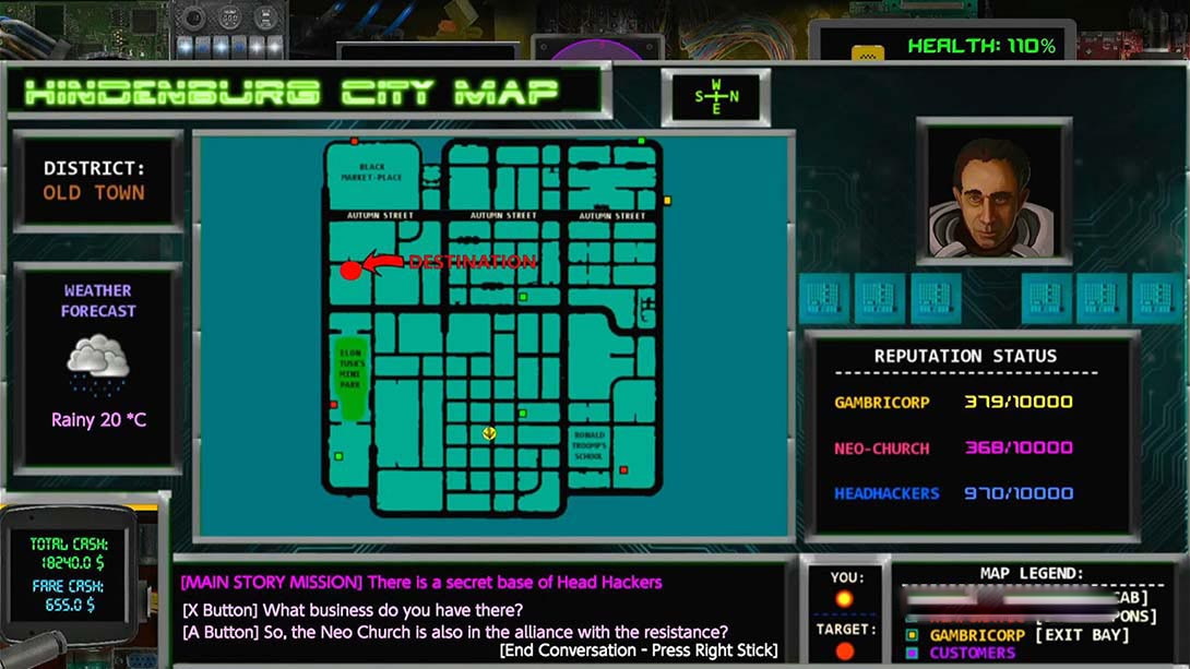 作为出租车司机,您必须完成不同派别的数十种任务,并可以进入兴登堡市其他地区。在危险的漫游期间,您将有机会为出租车购买各种武器,盾牌和小工具。在您的旅途中,您会遇到数百名客户-与他们交谈以获取有价值的信息。也许您可能有机会生存和逃离这个不安全的世界末日后的市区。