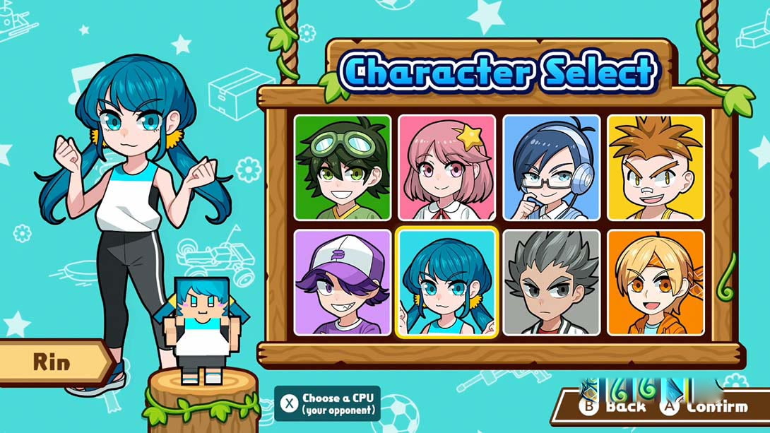 选择 8 个独特角色中的 1 个,开始游戏! 用点球大战、遥控赛车和喷枪战