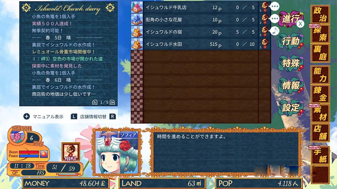 ●被建立的店铺根据季节被更新,收入和需求高的店铺,物品到手的店铺,招来很多客人发展可能的店铺等等,每个店铺有各种各样的特征。一边比较店铺的特征一边选择在商店街建造的店铺,是商店街运营的关键。