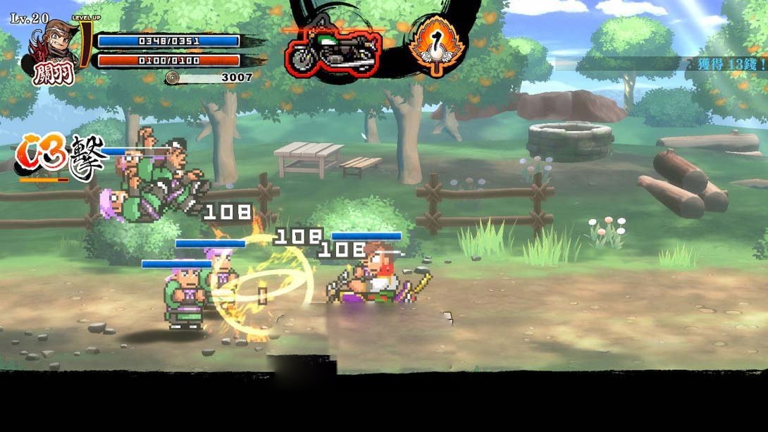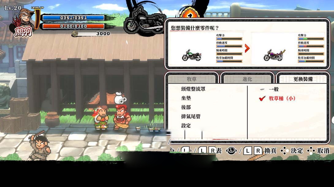 可以乘坐「赤兔馬(摩托車)」在各關卡間移動。不須多言就把途中出現的敵人揍飛吧!