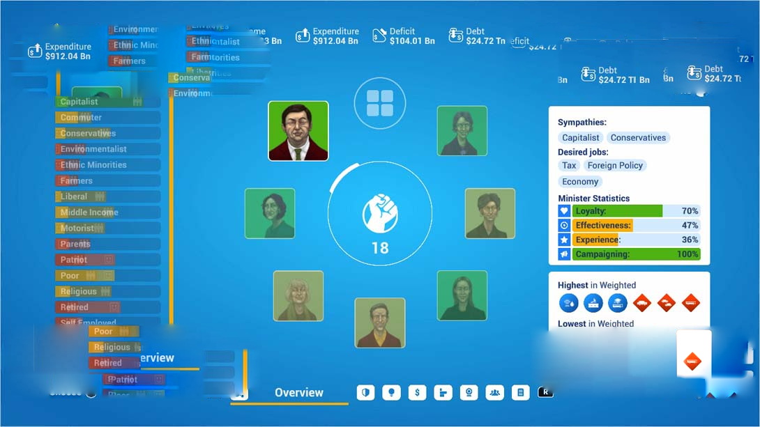 这是一个策略游戏,你的政策和法律的结果反映了你的成功。如果你想废除所有的公共开支和税收,你可以这么做。它可能成功,也可能失败,这取决于你如何处理它。