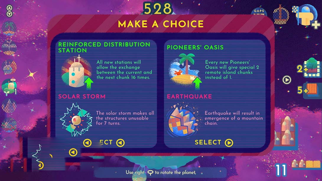 通过您的瓷砖放置选择发现特殊结构。这些独特的功能允许特殊的动作,如洗牌下一个形状或放置一个独特的物体在星球上。