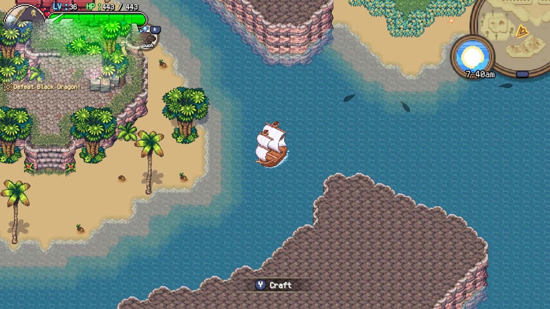 玩家可以通过剧情发展获得一艘船。玩家可以自由上下船,探索广阔的像素世界。