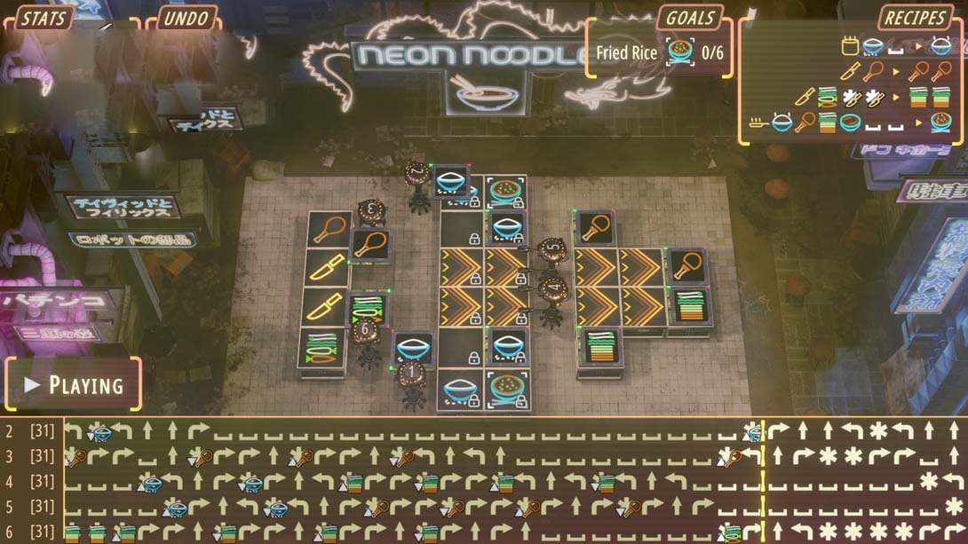 《Neon Noodles》是一款融合赛博朋克美学与自动化编程玩法的解谜游戏,背景设定在食物成为阶级象征的反乌托邦未来。玩家需通过图形化编程操控机器人主厨,完成全球250种食谱的自动化烹饪流程。以下是核心亮点: