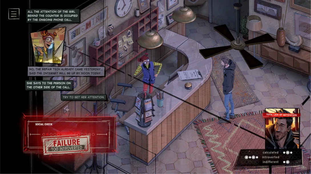 时间循环与人格系统:玩家扮演被困在时间循环中的主角Harrow,每次循环约47分钟,通过分配“果决—社交—情感”人格点数解锁不同特质(如偏执、焦虑),影响对话选项和剧情走向。