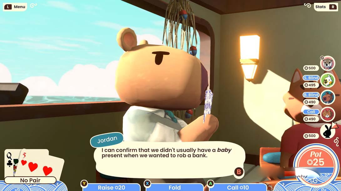 阳光洗牌是一个叙事扑克冒险与犯罪的过去和可爱的服装说话的动物!和“晨班”的剩余成员一起玩德州扑克,这是一群工人阶级的生物,他们变成了罗宾汉,穿过了“鱼帮”,大部分人都活了下来,讲述了这个故事。在游戏中揭开东海岸最大的银行如何在一个下午被抢劫的故事。赢得手来赚取代币,用新的灯具、椅子、卡组等装饰S.S. Sunshine。当你凝视着一只一无所有的12岁小猫冰冷的眼睛时,试着随着游戏充满活力、令人扭动的原始斯卡配乐起舞。