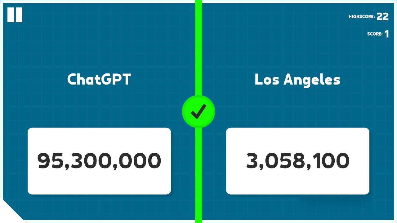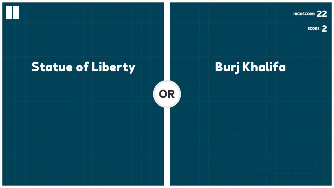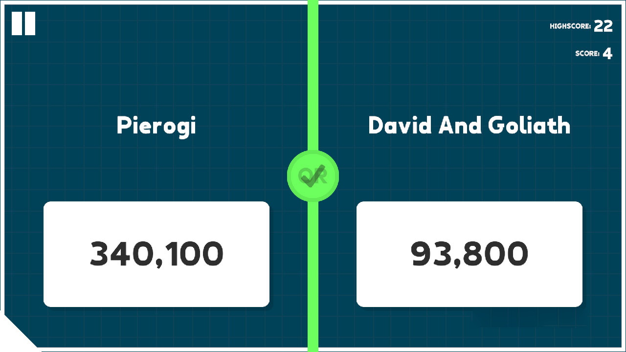 踏上史诗般的任务,征服网络,因为你面对的是有趣的选择对。规则很简单:猜猜哪个选项获得更多的网络搜索,每正确一个选项就得+1分。但是要小心——一个错误的决定会让你回到起点。