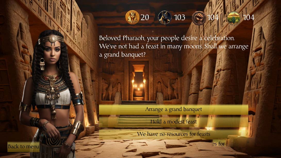 穿上古埃及法老的金凉鞋,带领你的帝国穿越时间的沙漠。解决你的臣民的各种问题,从国家事务和精神困境到宫廷阴谋和浪漫。你的决定要么会积累财富,增强经济,用宏伟的寺庙和金字塔来美化帝国,要么会导致它的垮台。与神接触,平衡他们的恩宠与愤怒。每个选择都编织成你统治的丰富挂毯,过去的决定塑造未来的挑战。明智地统治,避免叛乱,保持神圣的恩惠,确保你的遗产万世长存。