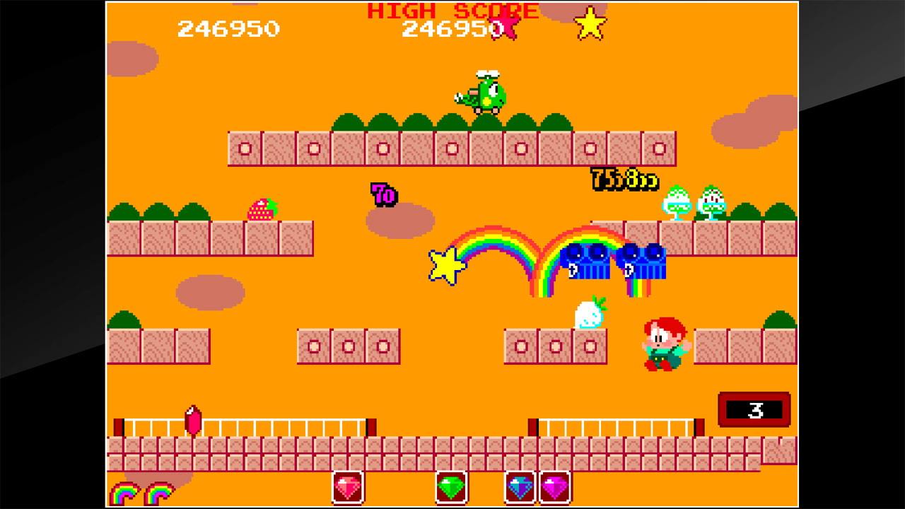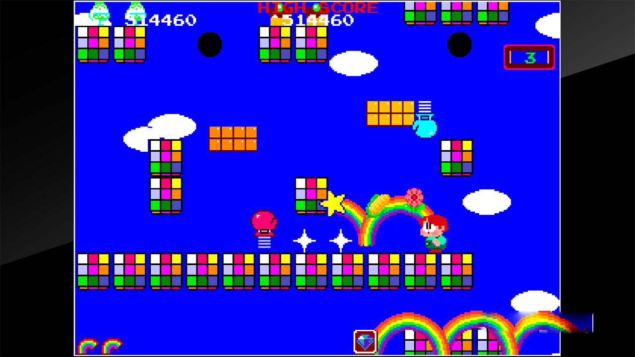 这是《BUBBLE BOBBLE》的续集,其中芭比和鲍比回到了人类的形态,用他们的彩虹魔法去彩虹群岛旅行,从阴影老板的魔爪下拯救村民。