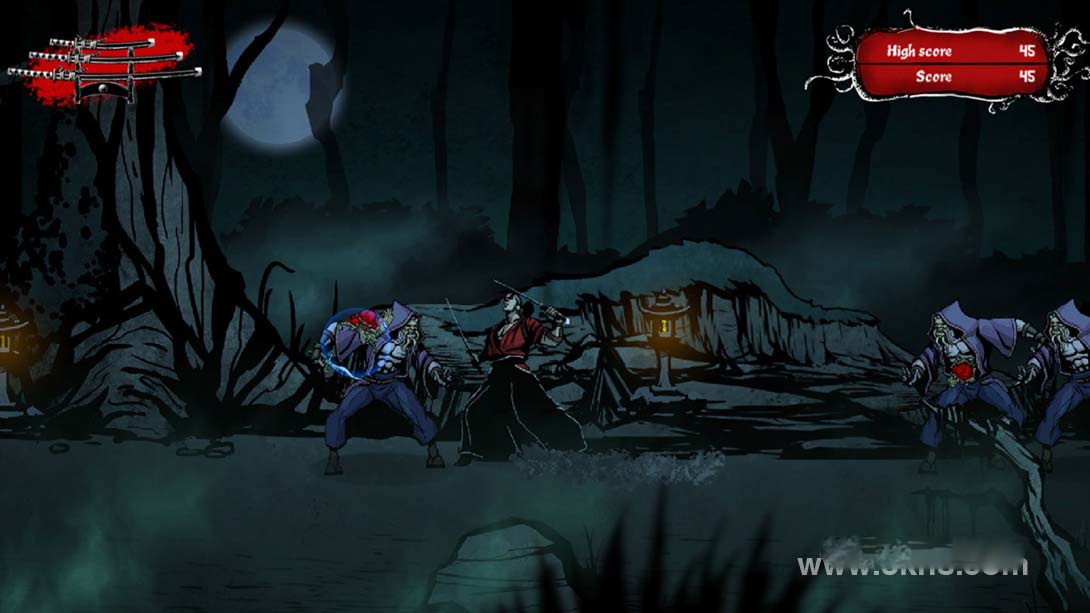 浪人是一个可怕诅咒的受害者,这使他成为无法形容的怪物的目标。在每场比赛中,成群的怪物会不断地出现并攻击,直到没有人站在那里。