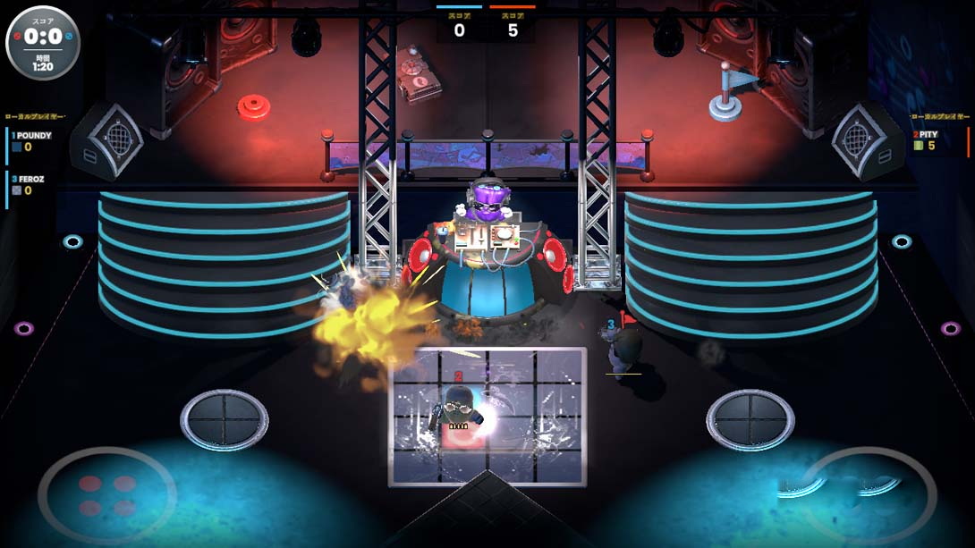 赌上生死的战斗。并没有那么严格。即使被淘汰一次,经过一段时间后也能复活,继续比赛。基本的武器只有5发子弹,重装需要时间。因此,推敲战略,得到在地图上随机出现的奖励武器是关键。游戏结束时,显示最活跃的玩家,以及各玩家的获得点。另外,根据活跃的等级,播放布拉内克的动画。