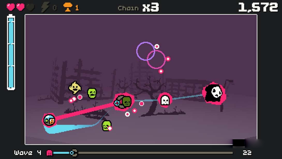 switch《抓捕幽灵3000》一款有趣的独立动作游戏,在游戏中,你将使用光束消灭幽灵,将它们连接起来,一次性全部消灭,连接的越长奖励越高,还能够在积分商店中兑换商品。