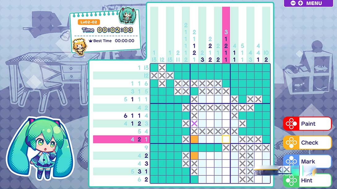 switch《初音未来逻辑绘画S 初音未来 Logic Paint S》游戏玩法为用数字填充方格来完成图片,从小尺寸的“5%uD75”到大尺寸的“15휕”,无论是新手还是专业玩家都能通过不同的游戏难度获得良好的体验,此外还有机会挑战超大谜题以完成大图。