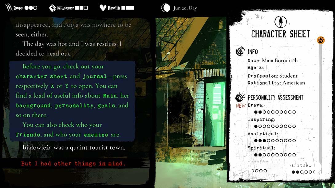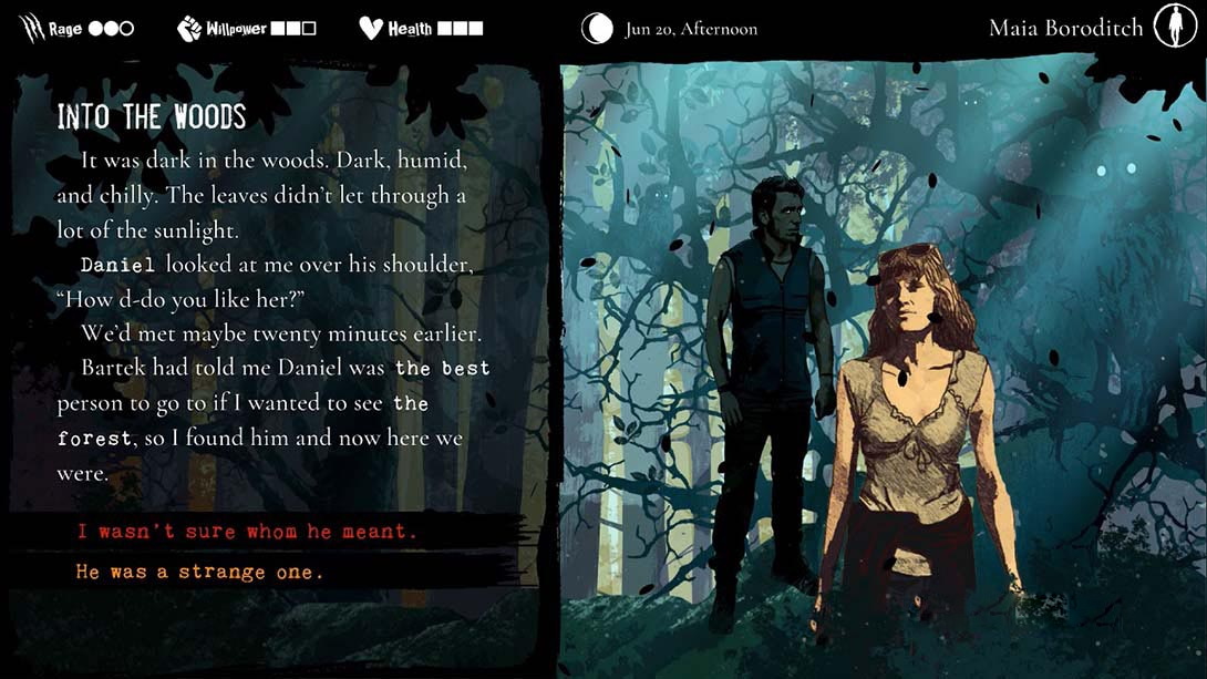 探索欧洲最后原始荒野的神话和怪物。扮演玛娅,谁到达古老的比亚索维尼亚森林,探索她的家谱。发现愤怒在冒险游戏灵感来自传奇桌面角色扮演游戏狼人:启示的体验。