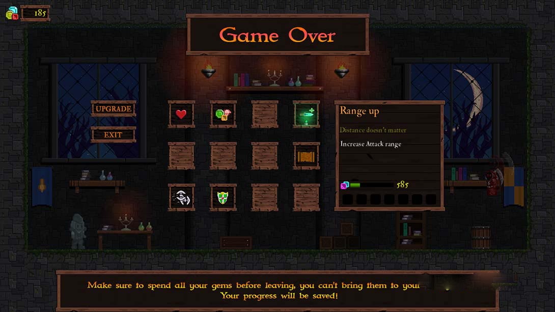 – Rogue-lite – 每个关卡的不同布局都是随机选择的。在有机会记住关卡并变得更好的同时,“随机关卡”系统将保持您的兴趣。使用您收集的宝石,您将能够在游戏结束屏幕上升级您的角色。