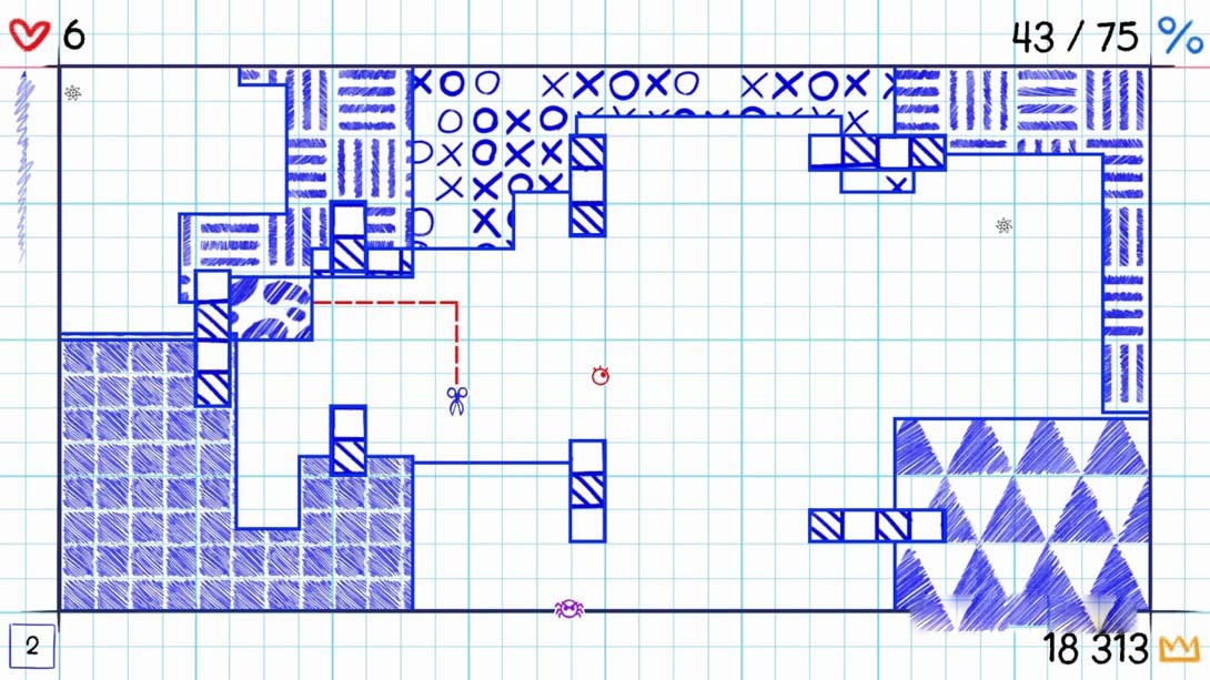 你控制了一个在笔记本上爬行的涂鸦虫。当你移动时,你在身后画一条线。当你环绕一个区域时,你可以捕捉并涂鸦它。你的草图必须超过四分之三页才能获胜。