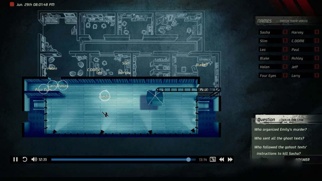 别指望别人会给你一堆线索。相反,你应该扮演墙上的苍蝇,观察和倾听事件的发展。任何人都可能是罪魁祸首;关键线索随时都可能暴露;任何角色的故事线都可能在任何时间点与另一个角色发生交叉。你是编辑——故事的顺序由你决定!