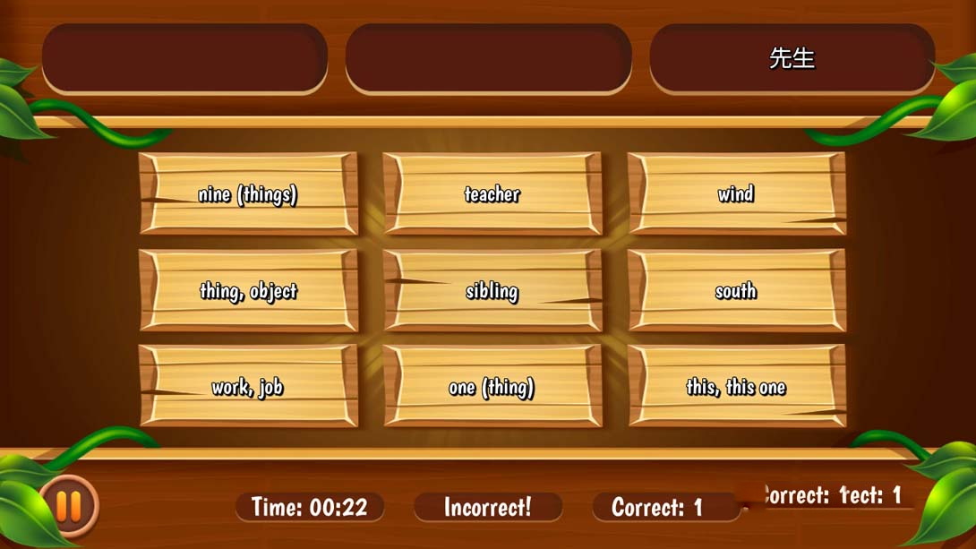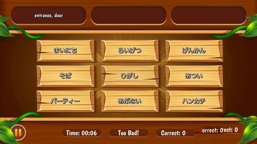 游戏的目标是将给定的单词从6000多个单词的字典中翻译成英语,假名或汉字——只需点击游戏板上9个可能的答案中的一个来选择。如果你卡住了,使用方便的提示来揭示额外的线索!