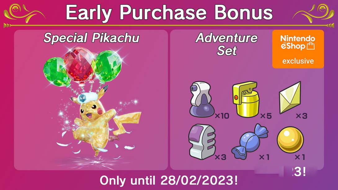 提前购买奖励。收到一个特殊的皮卡丘和一个冒险套装作为礼物!