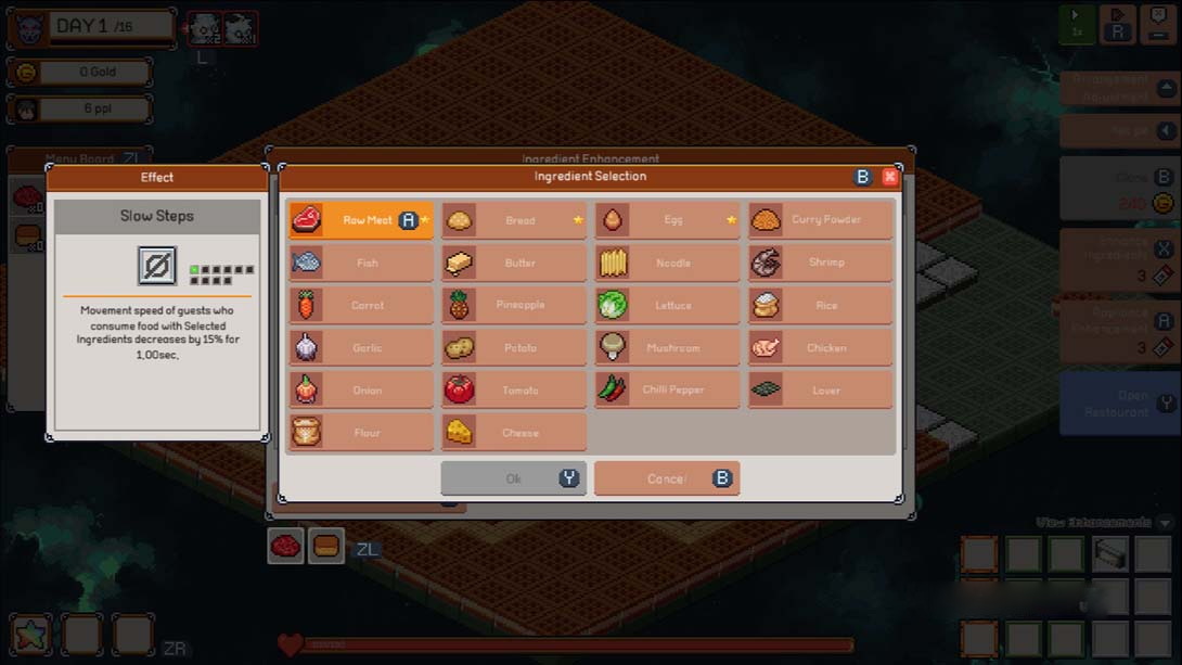 每个角色都有独特的特征。有些环境对角色有利,有些则不然,所以你要计划你的菜单,升级你的建筑,并根据你所选择的角色设计一个策略。